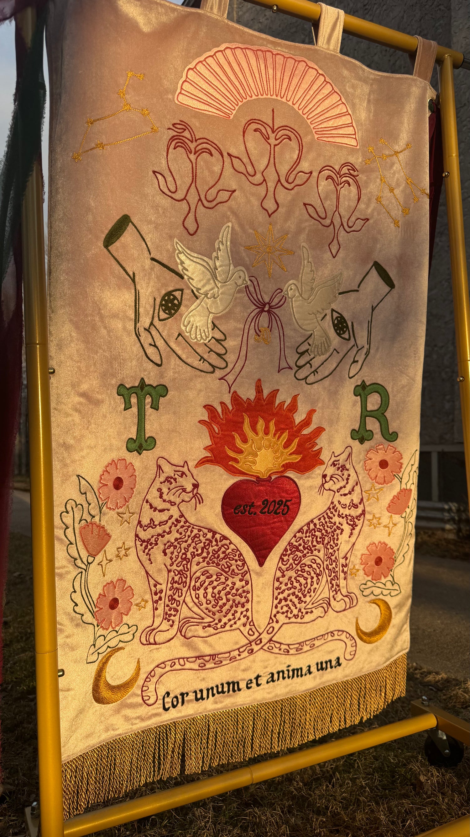 All of my banners are handmade and embroidered on my vintage chainstitch machine. I also incorporate other techniques such as appliqué and beading when appropriate.